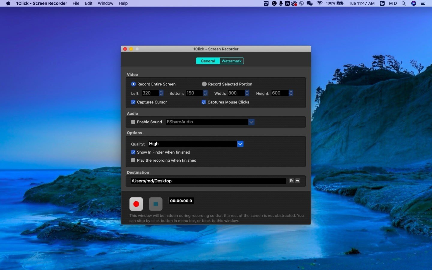 1 Click Screen Recorder 是一款操作极其简便的屏幕录制软件,其所有功能都清晰地展现在用户界面上。用户只需完成个性化设置,便可轻松自由地进行屏幕录制。此外,该软件还支持自定义文件质量参数,并允许用户为视频添加个性化的文字或图像水印。