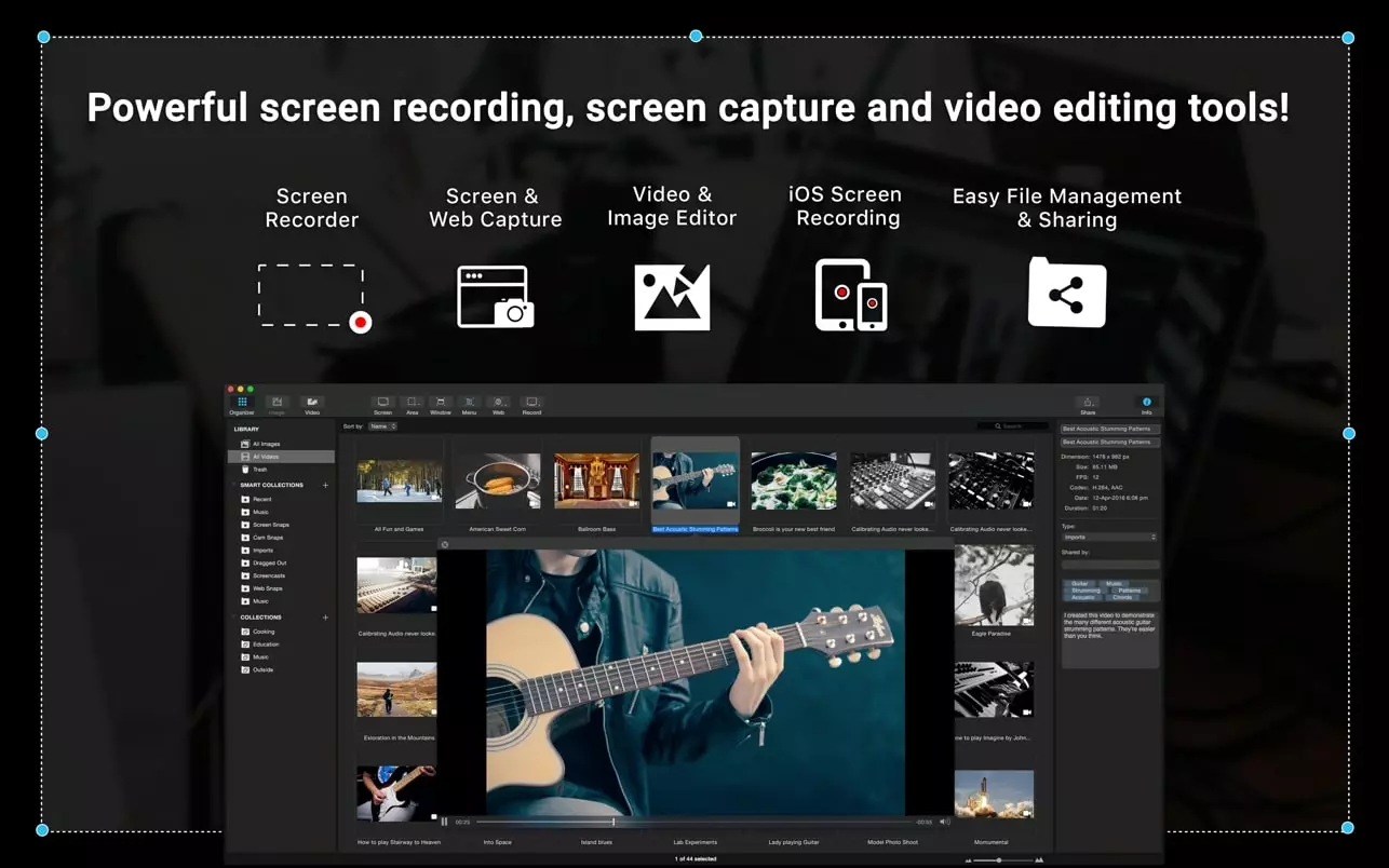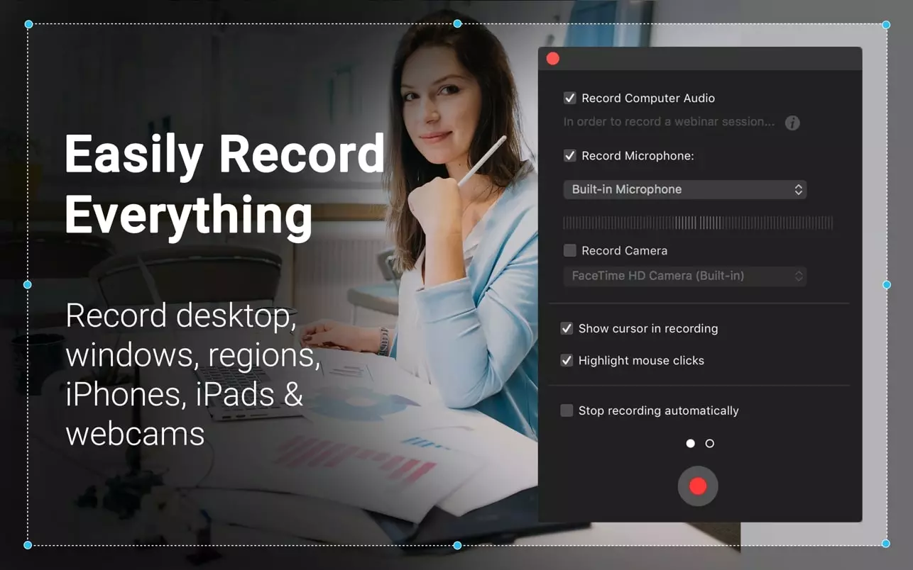Capto 是制作视频教程的理想录屏工具。它比其他屏幕捕捉软件更简单、更快。您可以创建带有画外音和前置摄像头录像的全面教程,前置摄像头拍摄的视频将显示在屏幕底部。