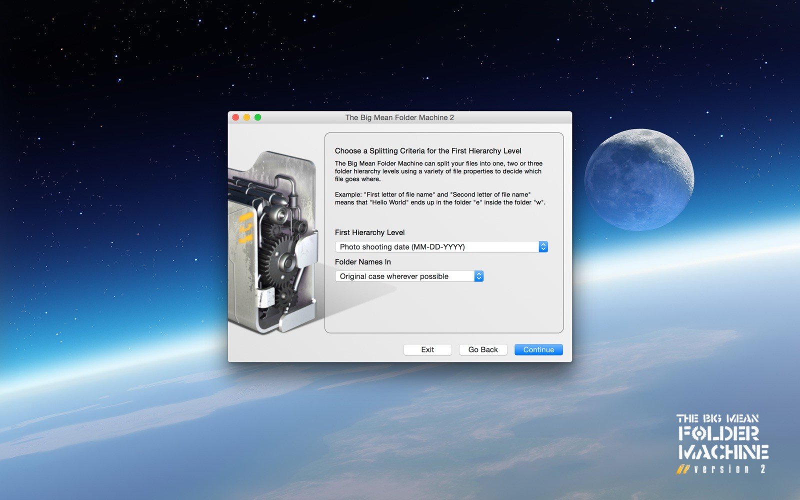 Big Mean Folder Machine 了解您的数码照片(包括 JPEG EXIF 或 RAW 文件)中嵌入的拍摄日期和时间。只需点击几下,您就可以将整个照片集重新整理成自定义的文件夹层次结构。想按年份和月份整理您的照片吗?只需点击几下即可完成。更喜欢更深的层次结构,包括年、月和日期?点击几下即可完成。
