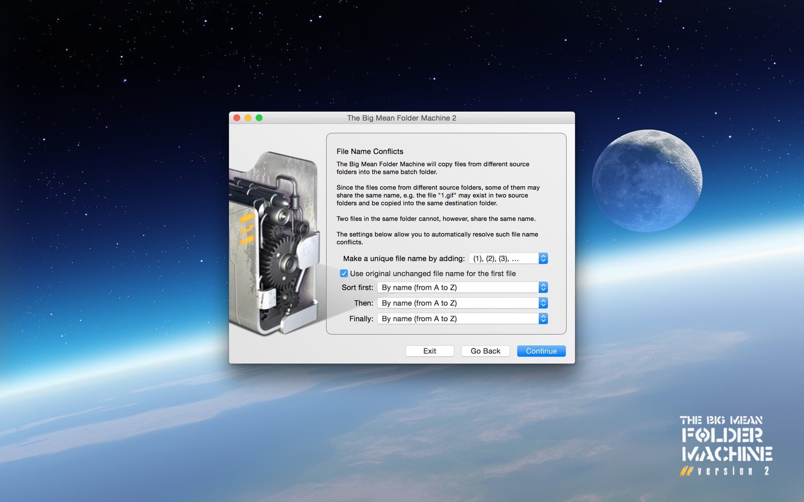 Big Mean Folder Machine 不仅可以将文件拆分为文件夹,还可以执行相反的操作:将来自许多文件夹和文件夹层次结构的文件合并到一个文件夹中。手动执行此操作不仅极其繁琐,而且当您遇到多个文件夹中具有相同名称的文件时,还会遇到实际问题。Big Mean Folder Machine 通过可自定义的文件名冲突解决算法解决了这些问题。
