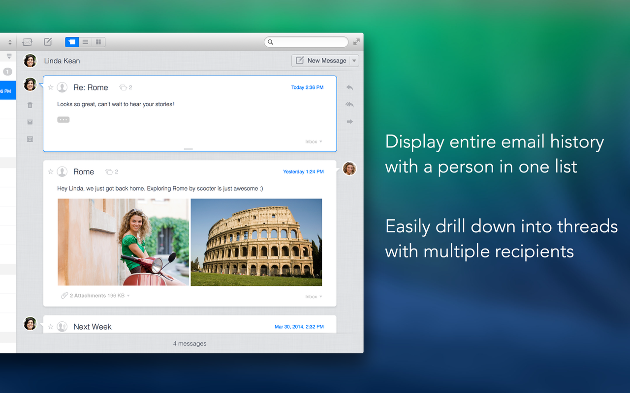 想象一下:你的电子邮件就像即时通讯消息一样。是的,所有交流都在一个窗口内完成,无论你是在阅读还是回复。这样你永远不会丢失对话的线索。在撰写邮件时,应用只会占用必要的空间,为你提供几乎无限的空间来查看其他邮件和附件。