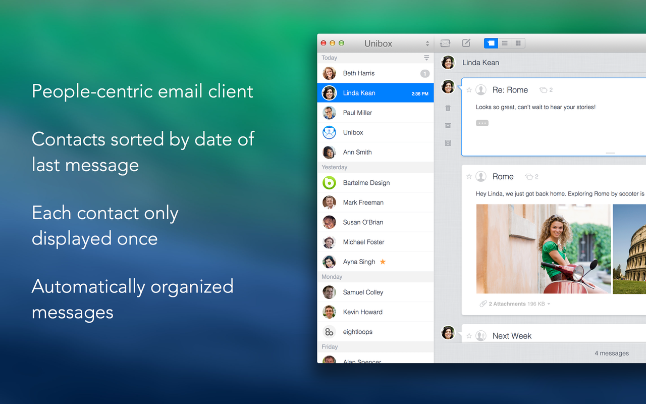 Unibox能高效整理你的邮件,帮助你清理收件箱。一旦开始使用这款可靠的Mac邮件客户端,你将体验到使用的乐趣。但请注意:它好用到令人上瘾。用过Unibox之后,你将很难再适应其他Mac邮件应用。