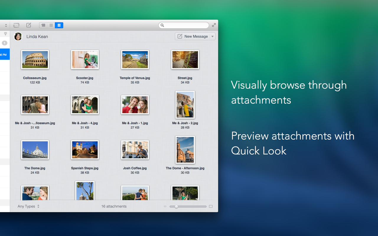 Unibox提供更便捷的附件预览方式。你可以选择让附件作为对话的一部分,或切换到其他两种视图模式。选择“图标”视图,以方便的网格形式查看附件的小缩略图;选择“列表”视图,则以表格形式获取附件的详细信息。