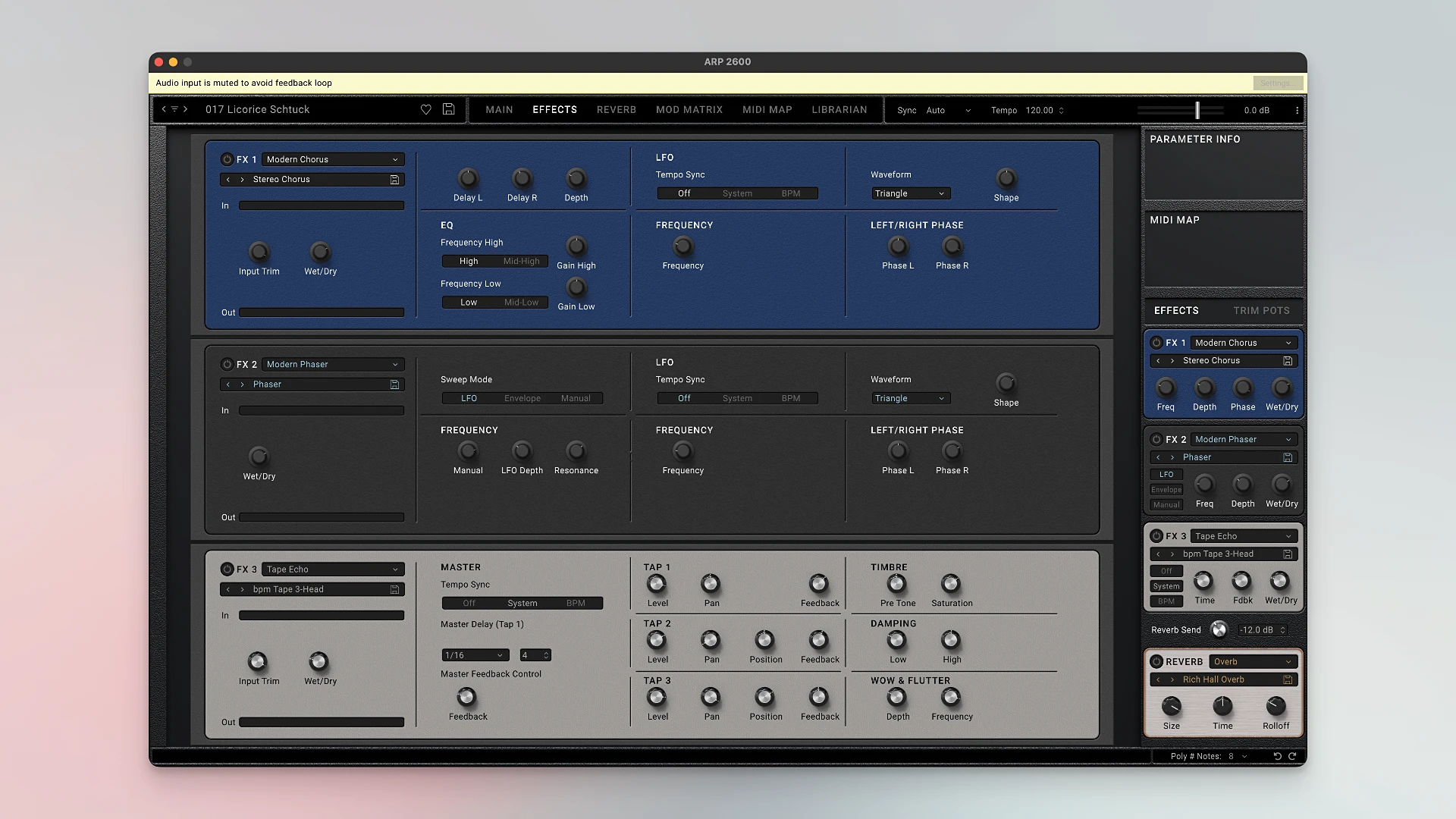 • 这款插件可重现 ARP 2600 的真实波形、滤波器(4012 和 4072)、低频振荡器(LFO)、包络和跳线面板,从而为低音、主音和音效提供标志性的模拟音色。