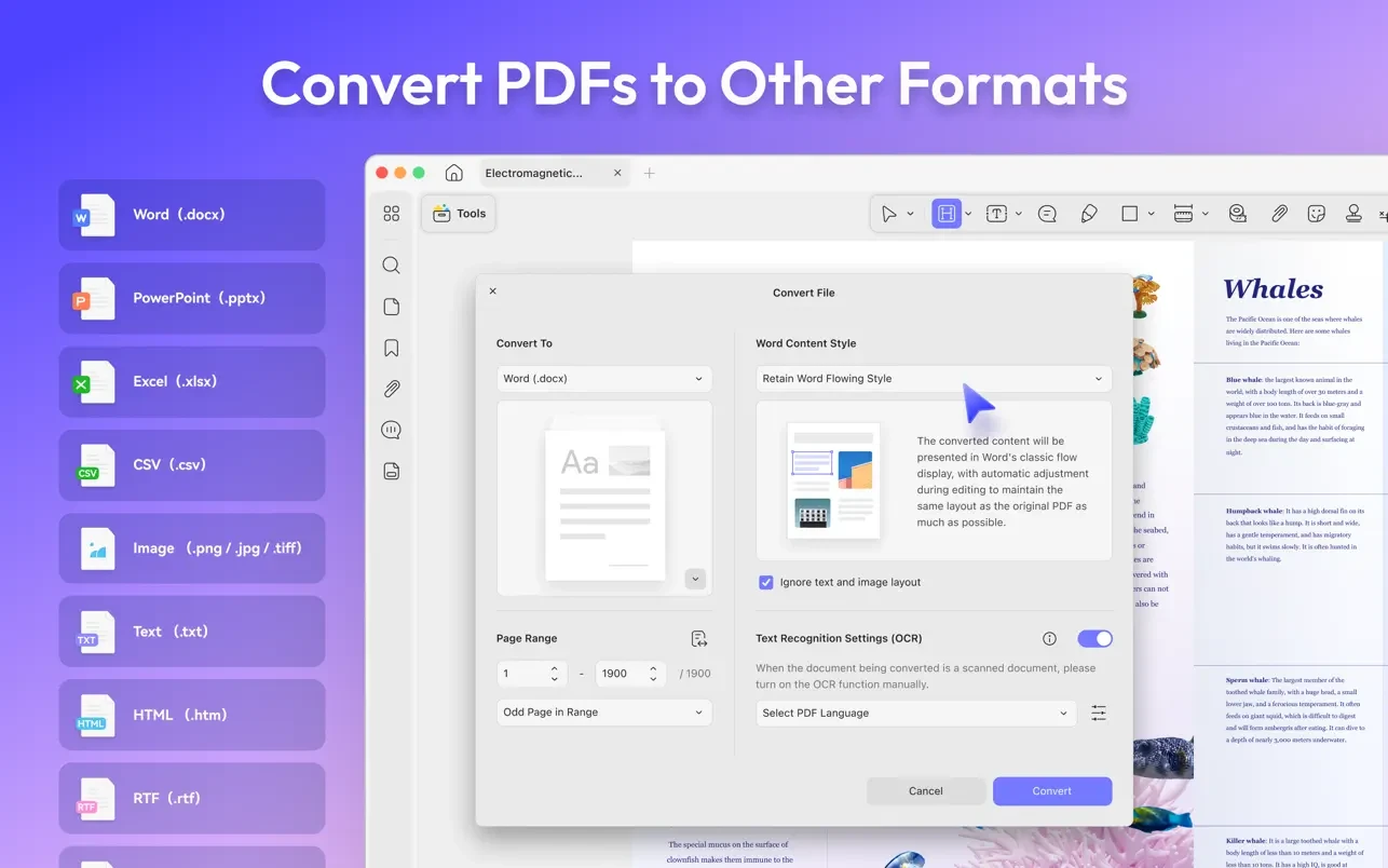 • 将 PDF 转换为 TXT、RTF、CSV、HTML 和 XML。