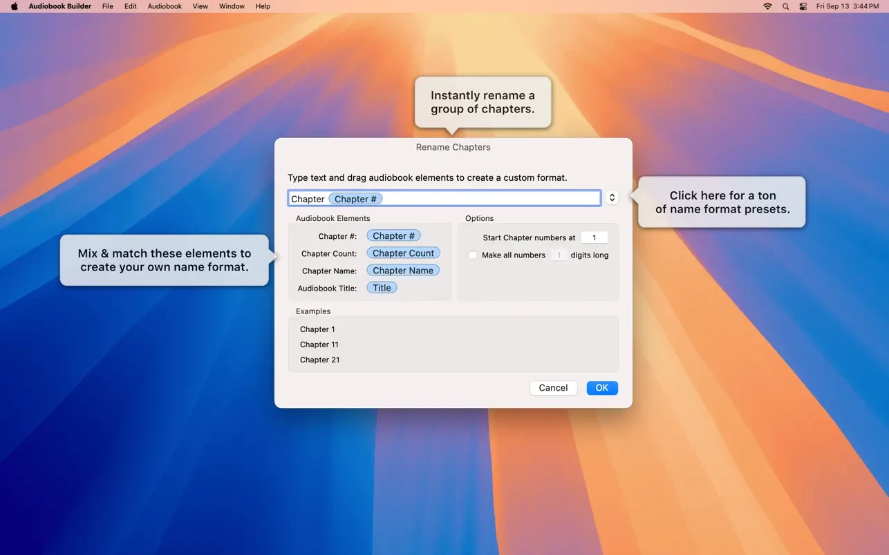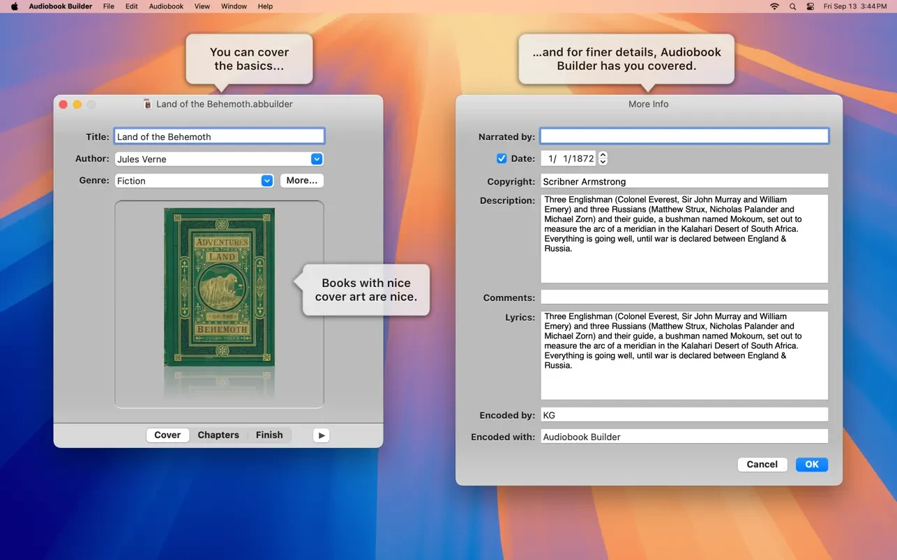 Audiobook Builder 是一款专为将音频文件和 CD 转换为适用于 iPhone、iPad 等 **Apple 设备** 有声书而设计的软件。它能够将多段音频合并,创建带有自定义标题和封面的章节,并允许用户调整音频质量。
