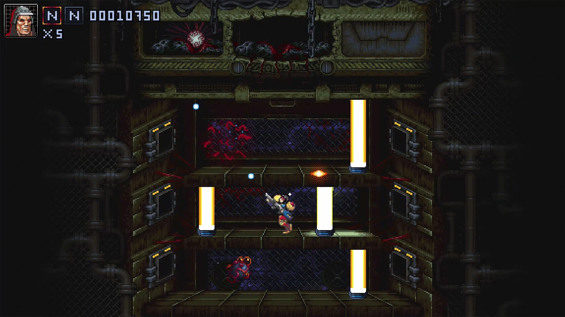 《铁肉》致敬了过去的经典“跑轰”游戏,将紧张刺激的头目战分为多个阶段。游戏提供三种难度供玩家选择,挑战自我。难度越高,头目战也会变得更具挑战性。