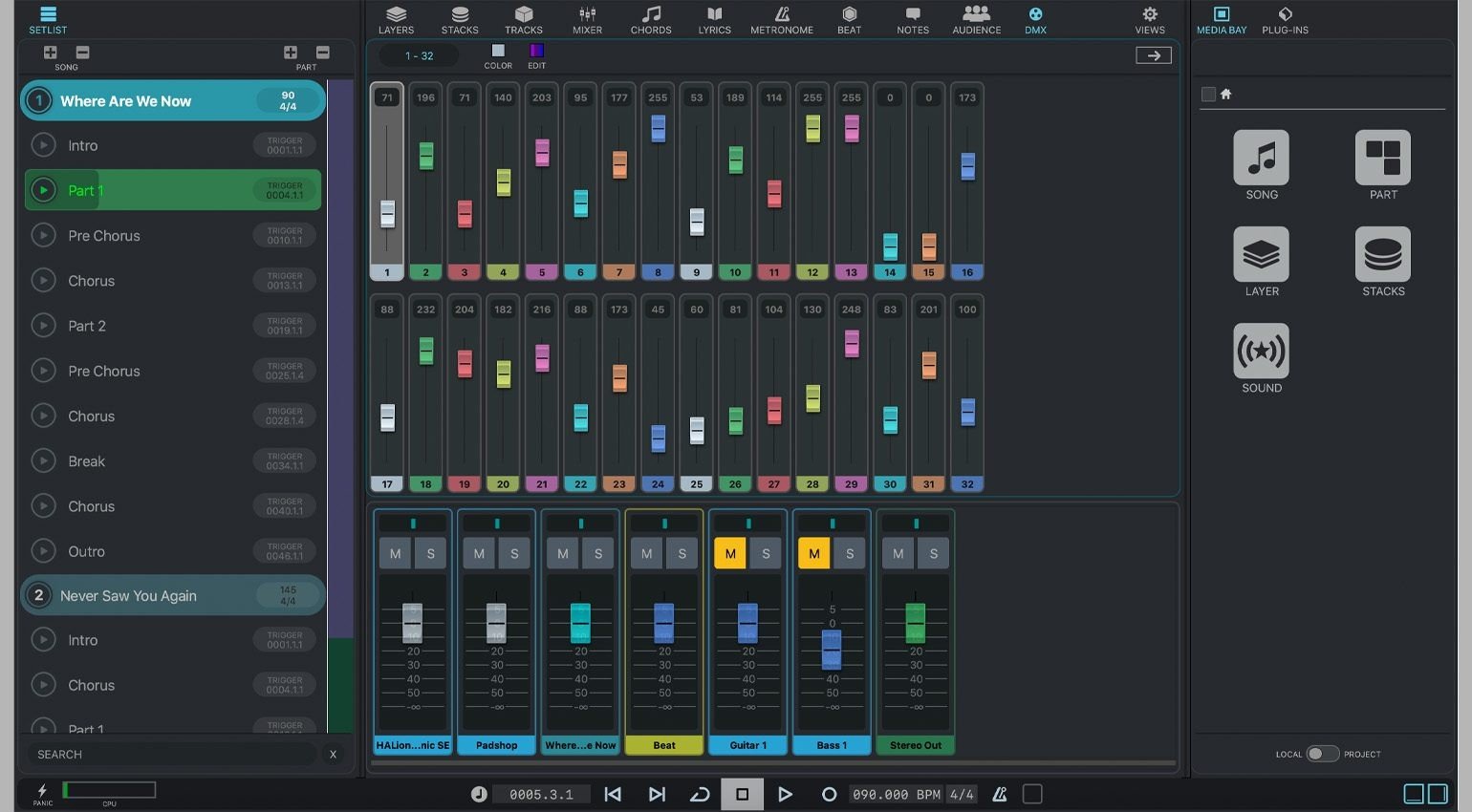 VST Live 拥有为舞台准备歌曲所需的所有功能。对于音频,它包括一套广泛的虚拟乐器和一个内置的音序器,具有同步功能,可以精确同步每一个节拍。您还可以在其他设备上显示歌词和和弦符号,这样大家就可以“齐心协力”了。当然,您的灯光和视频必须与音乐紧密结合,因此 VST Live 允许同步灯光,并提供您需要的尽可能多的视频轨道,确保所有事情都在正确的时刻发生。
