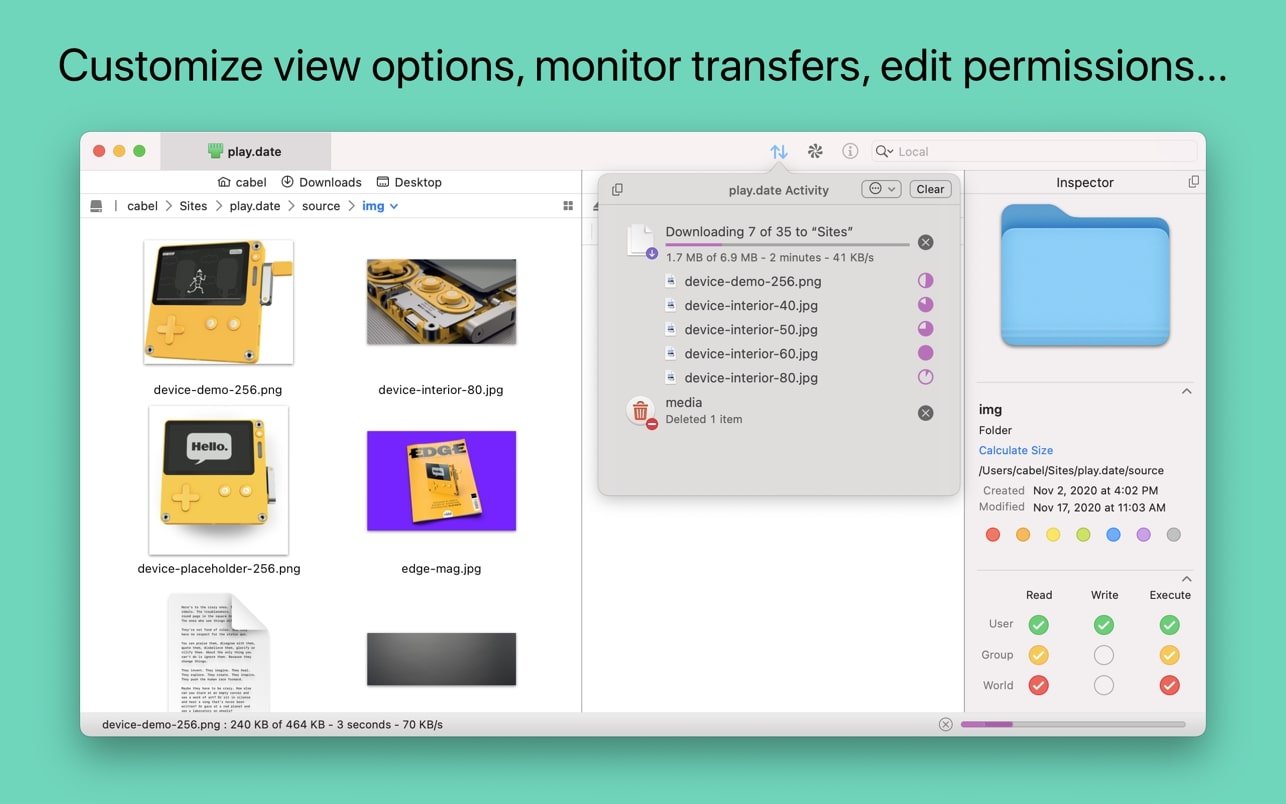 macOS 文件传输应用程序的黄金标准已迈向未来。通过简单、熟悉而强大的用户界面,您可以上传、下载和管理大量服务器上的文件。Transmit 5 具有以下特点: