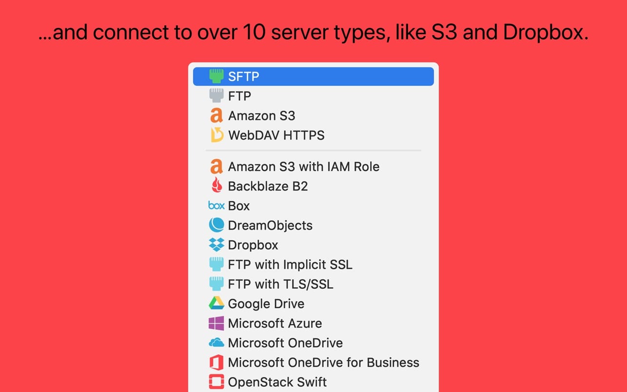 而且,Transmit 仍然比任何其他应用更好地处理经典协议——**FTP**、**SFTP**、**WebDAV** 和 **S3**。我们将复杂的服务转化为简单的拖放操作。