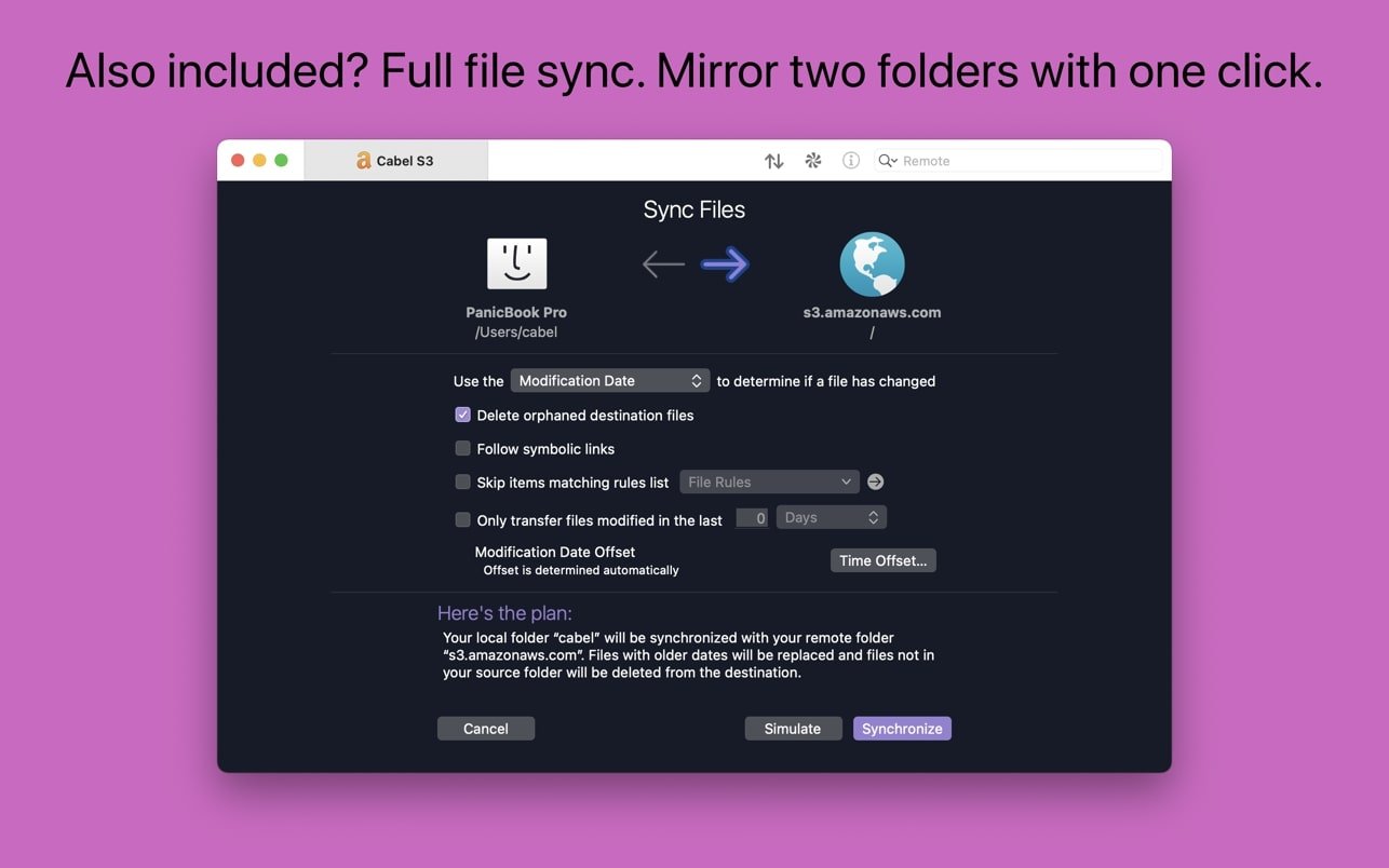 Transmit 5 现在包含了 **Panic Sync**,这是我们安全快速的站点同步方式。我们可靠的文件同步功能增加了对本地到远程同步以及本地到本地同步的支持,并为您提供了更精确的控制。