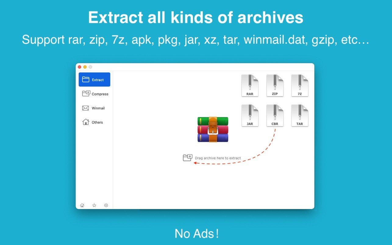 - 支持解压超过 60 种存档格式,包括 RAR, ZIP, 7Z, WINMAIL, TAR, GZIP, GZ, BZIP2, LZIP, ACE, ISO, PAX, PKG, APK, LBR, MSI, JAR, XZ, LZMA, BZ, LZH, CAB, CPIO, NRG, MDF, ZMA, ARJ, LQR, SPK, SWF, NSA, RPM, CPT 等。