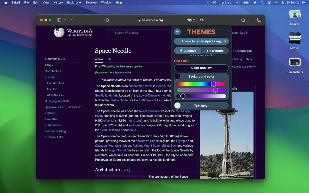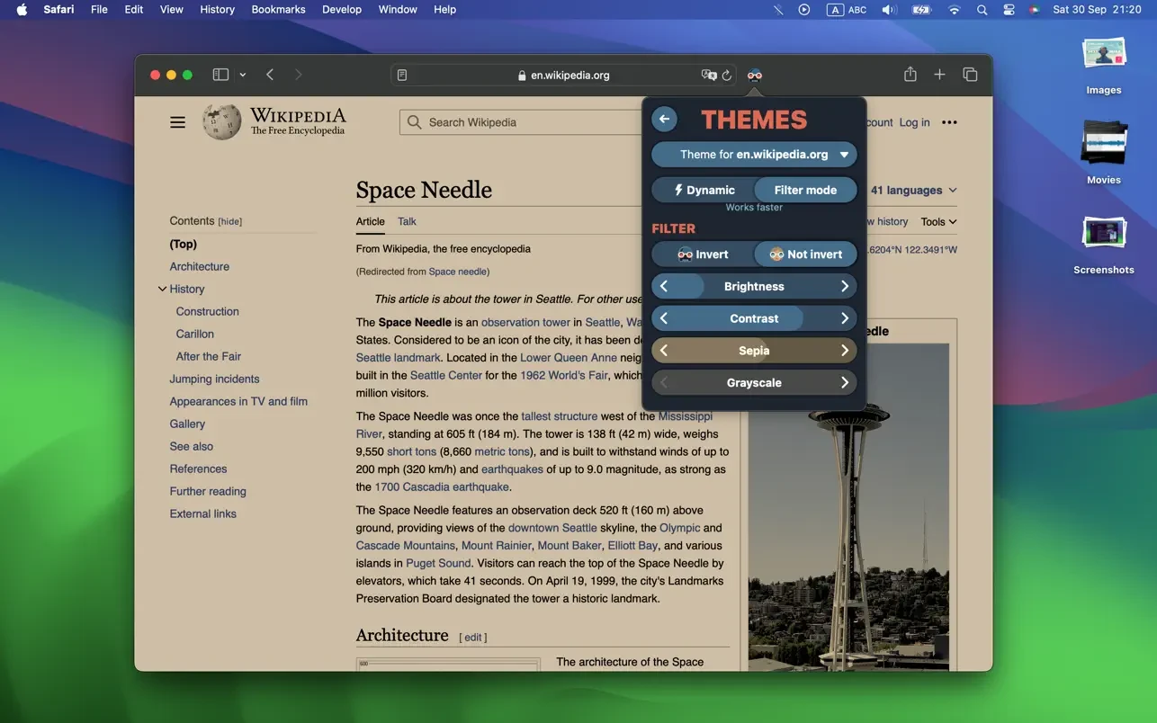 根据您的屏幕调整亮度、对比度,在“动态”和“滤镜”模式之间进行选择,为个别网站切换模式,并根据系统深色模式设置自动切换。