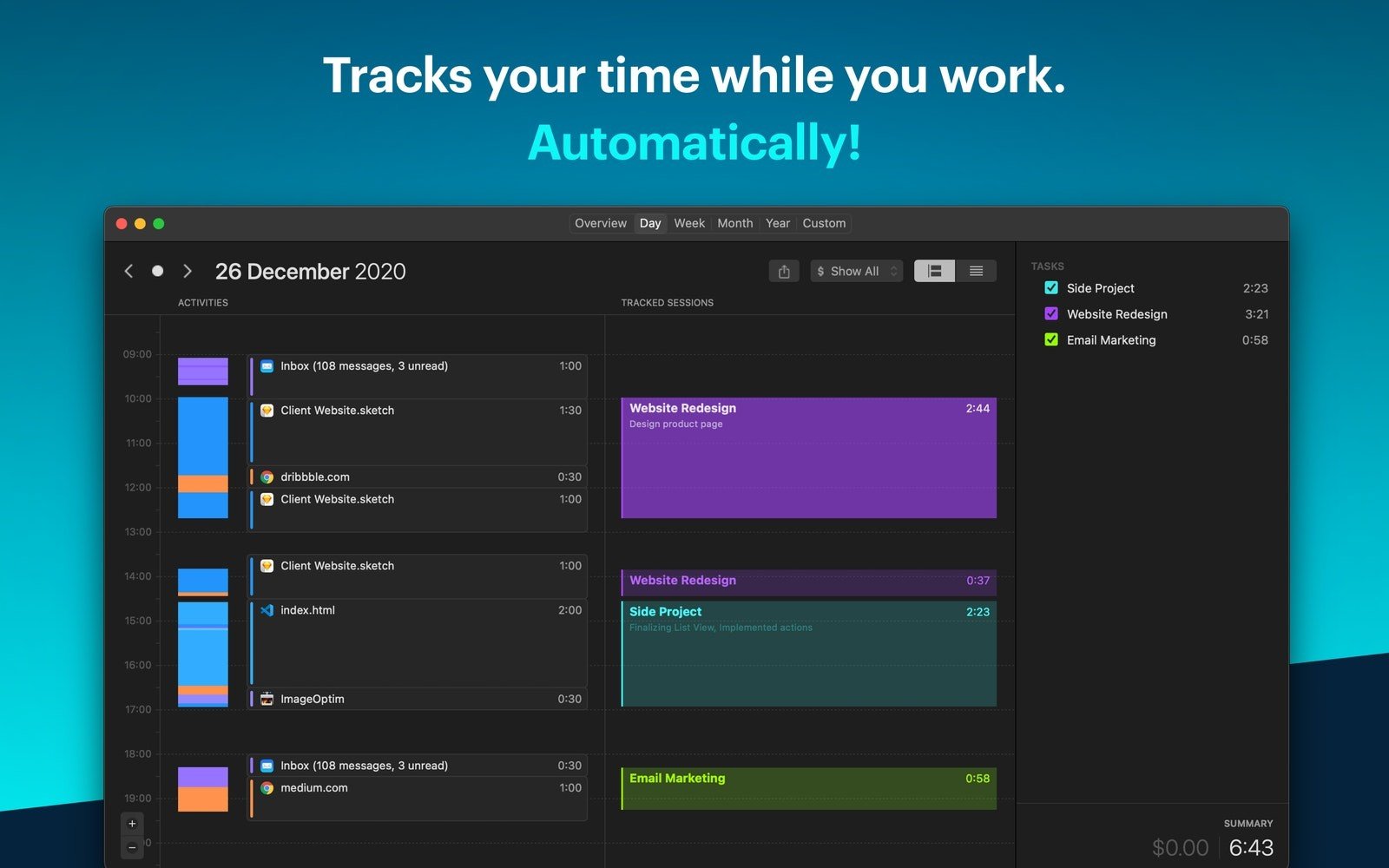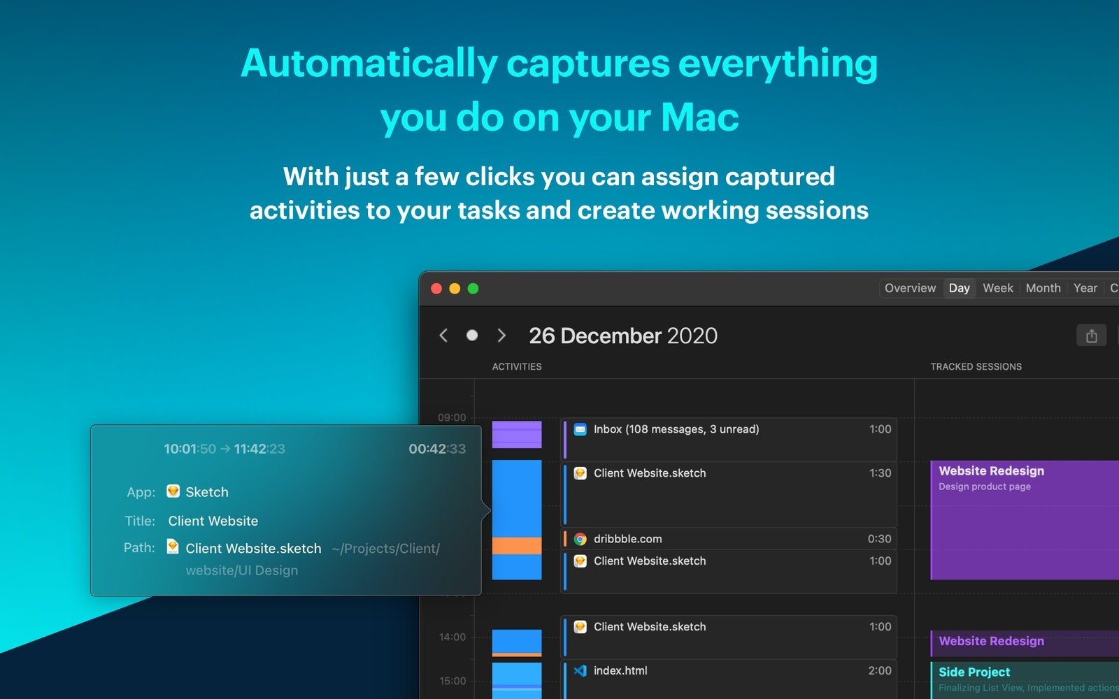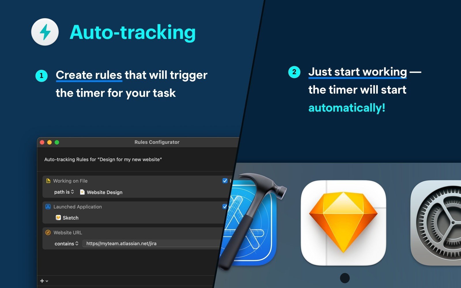 Timemator 了解您正在处理的任务类型。如果您是一名设计师,它会知道您什么时候在使用 Sketch 进行设计、开发项目或参加会议。这同样适用于开发工具和 Mac 上的许多其他应用程序 – Timemator 会识别您的任务,确保精准跟踪。