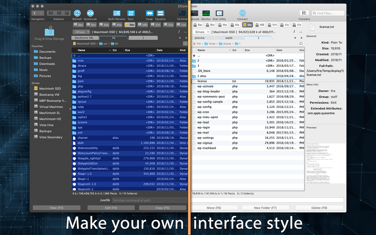 DCommander 引人注目且逻辑性强的外观设计是您 Mac 电脑上的亮点。在其直观的界面中,主要功能对应着大型彩色图标,让新手能迅速掌握程序。用户可以在常规视图和旨在减轻夜间眼睛疲劳的深色夜间主题之间切换。