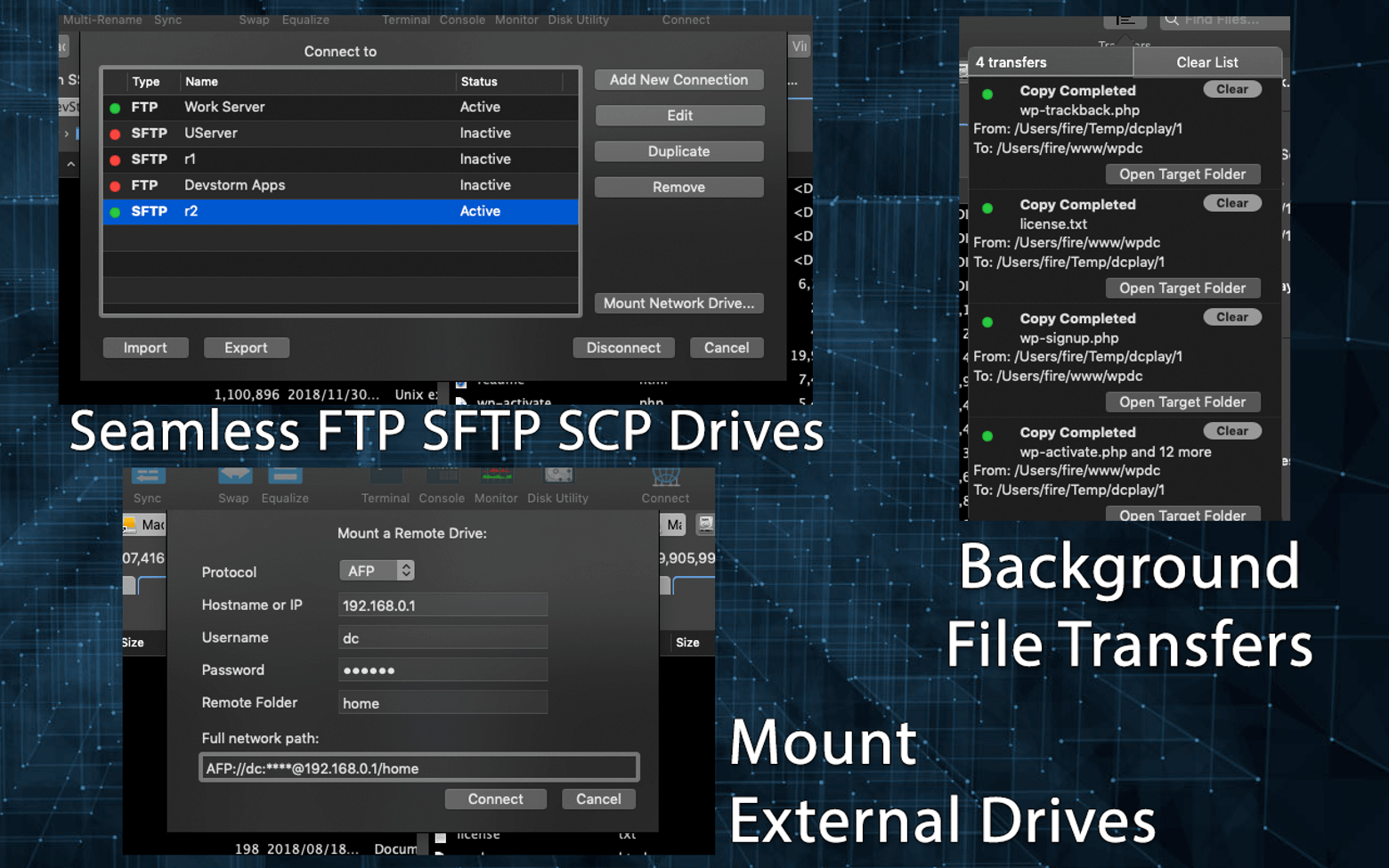 内置管理器允许您即时添加外部服务器和其他存储路径。您不仅可以连接到 FTP 和 SCP 驱动器,还可以预览并打开其中的外部文件。如有需要,DCommander 将为您提供另一种完全访问的选项。