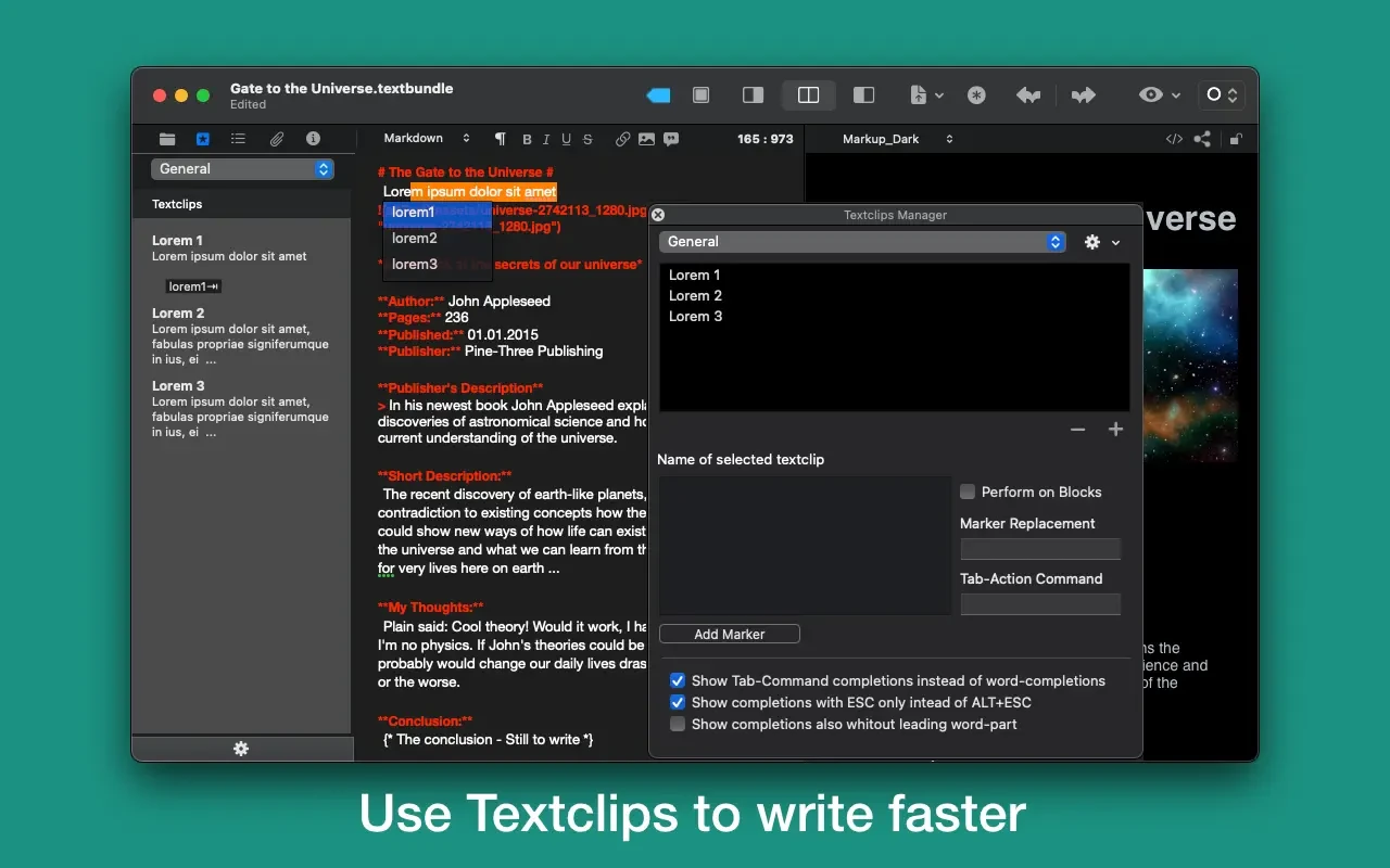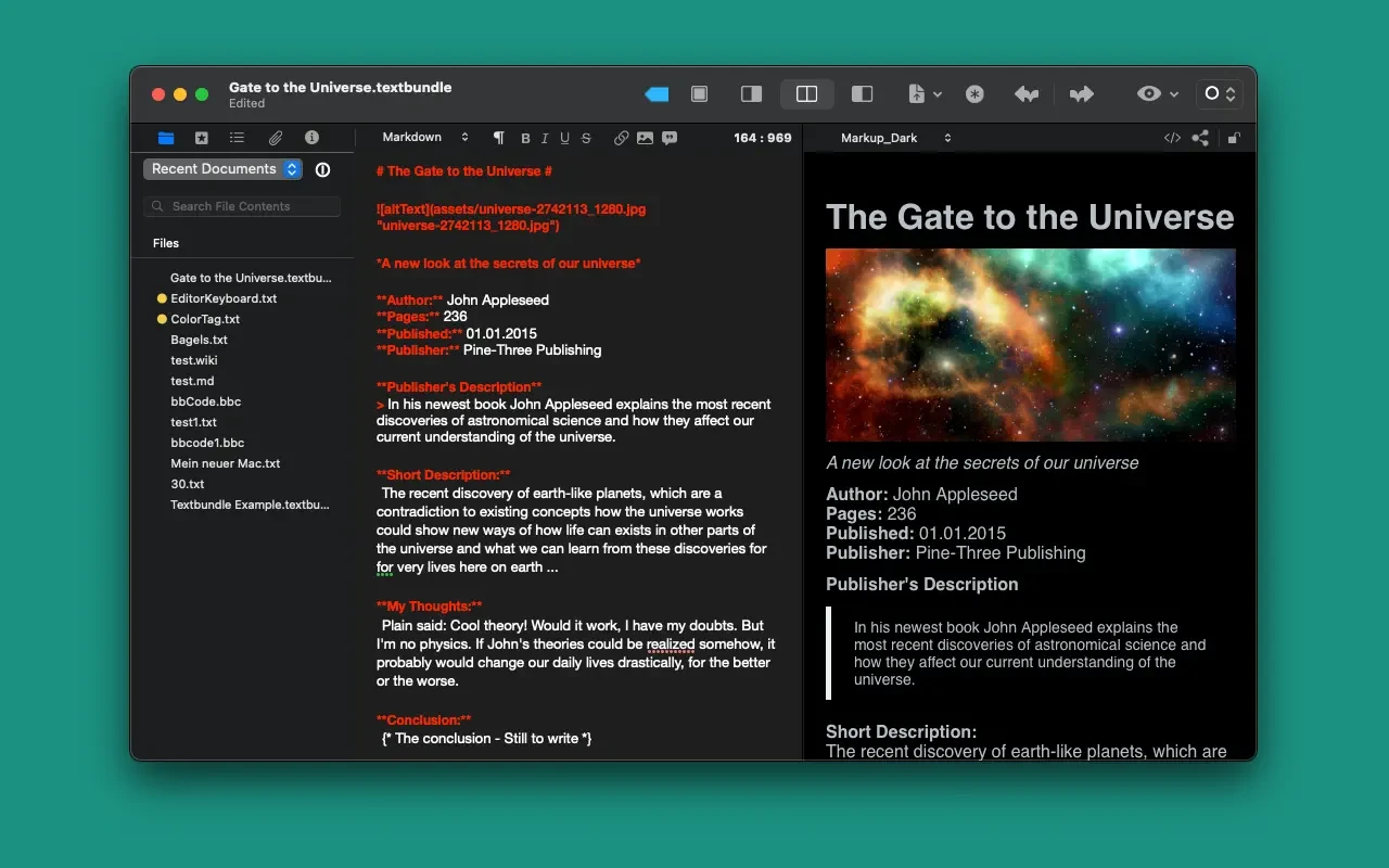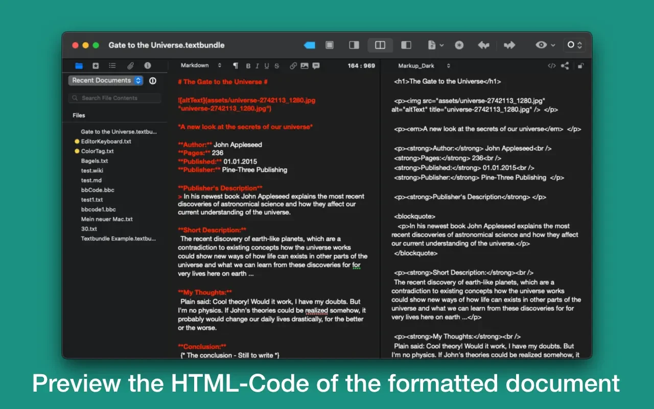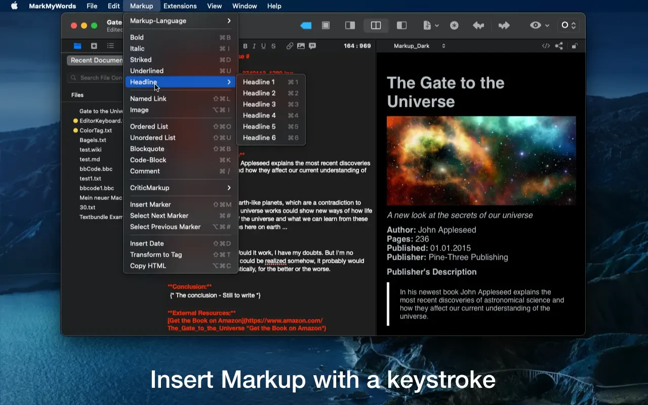 使用 MarkMyWords,你可以通过多种标记语言编辑文本,包括常见的 **HTML** 和 **Markdown**,以及 **MultiMarkdown**、**MarkdownExtra**、**Textile**、**Wikitext**、**BBCode** 和 **Smark** 等。