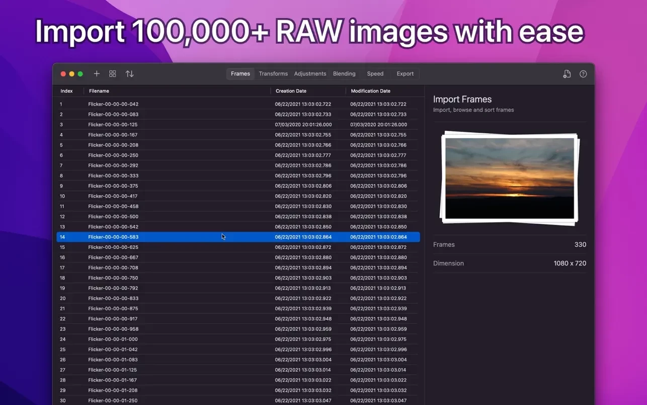 是一款专为慢动作摄影设计的理想工具。此应用可进行批量编辑、去除闪烁,并将图像序列组装成延时视频。GlueMotion旨在为您节省时间并指导您完成创作过程。借助其内置的批量编辑工具,您无需使用额外的应用程序。