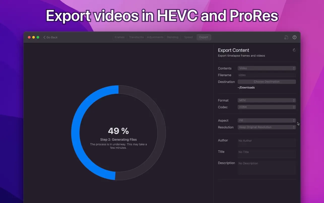 导出:导出的影片可以编码为H.264、Apple ProRes和HEVC格式。